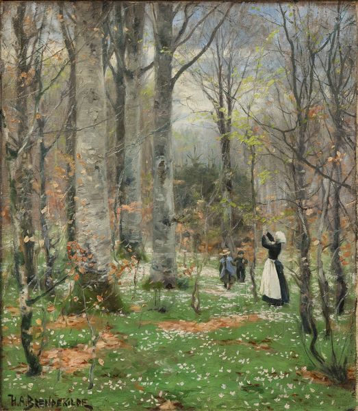 Curator: Let's take a moment with Albrecht Anker's 1872 oil painting, "At The Cemetery." Editor: Immediately, I'm struck by the somber stillness. The muted tones and the heavy, draped figures create a palpable sense of grief and quiet reflection. Curator: Anker, though known for his genre scenes of Swiss village life, presents here a formal depiction of mourning. Observe the social conventions embedded in the clothing, the veiled faces, signaling a community's visual language around death and bereavement. Editor: Absolutely. And notice how the artist situates these women not just in grief, but within a specific class and gender role. The attire speaks to their status, their expected performance of mourning within this societal structure. Are we meant to consider if it's performance, belief, or survival? Curator: These were questions very much in the air as established traditions met modernization in Switzerland. The growth of cemeteries as managed public spaces played an increasing social role at the time. Anker situates his figures very deliberately in front of a tomb with barely legible text, as a signifier of place but not a personhood. The climbing vegetation suggests life encroaching on death, hinting at resilience and nature's indifference. Editor: The tomb almost serves as a stage then, focusing us as viewers to assess the social roles being acted out in front of us. What about that landscape in the background? The visible monuments lead back to indistinct horizons. There's a journey implied by its path, but an ending to that journey as well. Curator: And, of course, landscape painting itself, since its popularization during the Romantic movement, served as a critical mirror of societal values. Here, in Anker’s hand, landscape underscores a very grounded realism, but touched by social narrative and individual stories of mourning. Editor: Thinking about Anker situating those lives during modernization underscores how genre painting doesn't simply show a scene. It invites critical questions about identity, tradition, and the broader political landscape of loss. Curator: It reminds us how art isn't just a pretty picture, it’s a window into the socio-political dynamics of its time. Editor: Indeed. Hopefully that adds to your appreciation of "At The Cemetery".