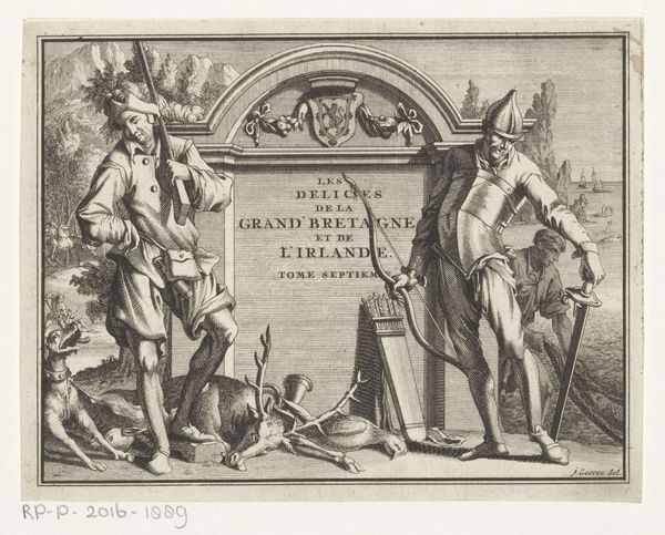 Editor: This engraving, titled "Allegorical Scene with Germanic Warriors" by Joseph Mulder, was created sometime between 1697 and 1725. It's striking how much is happening within a relatively small print. What's your interpretation of this piece? Curator: This engraving is fascinating when viewed through the lens of cultural identity. Mulder's baroque style almost romanticizes the "Germanic warriors" – but what is the artist’s, and the commissioner's, intent? It depicts an allegorical vision of a historical narrative. Consider the inscription – "Descriptio veteris Agri Batavi et Frisii" – describing the ancient lands of the Batavi and Frisians. Who were these people and why is their history relevant? Editor: So it's about reclaiming a specific historical identity? Curator: Precisely. The glorification of these warriors can be seen as a way to legitimize contemporary political power and national pride. Are these figures presented as heroic, or perhaps subtly critiqued? Does the style itself—Baroque—lend a particular weight to that glorification, masking any underlying critique? Editor: I see what you mean. The Baroque style could amplify the image's grandeur and potentially downplay other nuances. Curator: Exactly! It's a way to tie contemporary political claims back to an idealized past, even manipulating that past for political ends. Looking closer, does the composition serve to empower certain figures over others? How are gender roles constructed? Consider the contrast between the active warriors and the figure seemingly weighed down on the lower left. Editor: I didn't notice that figure as much. It's fascinating to consider this work as not just a historical depiction but also a political statement about power and identity. Thanks! Curator: My pleasure! Remember, art is rarely neutral. It's always participating in larger dialogues about who we are and how we understand our world.