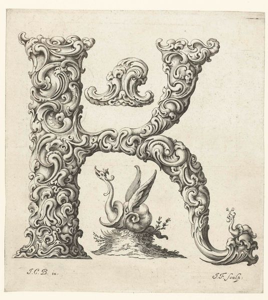 Editor: Here we have François Collignon's "Cartouches," an etching and engraving. The symmetry is striking, yet the hybrid figures seem quite bizarre. What visual elements stand out to you? Curator: The dynamic interplay of line and form is paramount. Note the curvilinear lines defining the winged figures, juxtaposed with the sharp angles of the wings themselves. How does this tension affect your reading of the piece? Editor: It does add a sense of movement, almost like the figures are in mid-flight. The line work also defines depth. Curator: Precisely. The varying densities of hatching create areas of light and shadow, lending a sculptural quality to the two-dimensional surface. A compelling study in contrasting elements, wouldn't you agree? Editor: Definitely, I see so much more now. Thanks for pointing out those nuances. Curator: A pleasure. Paying close attention to these elements is crucial to understanding the work's intrinsic artistic value.