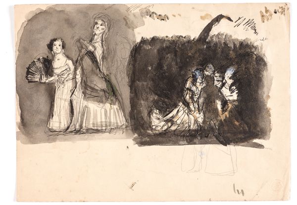 Editor: So, this is Philipp Rumpf's "Zwei Frauen mit Kindern im Freien," made with ink on paper. I'm struck by the rough sketchiness, almost like a fleeting glimpse into a casual scene. What catches your eye about this drawing? Curator: What intrigues me is the artist’s process and materials. Ink on paper… It’s such an immediate medium, demanding a certain speed and decisiveness. We see the artist's hand, their choices so bare. Do you see how the application of the ink varies? What does that tell us? Editor: Well, some areas have dense, layered strokes while others are more sparse, like he was testing the quality of the pen, or maybe building texture… Curator: Exactly! Rumpf seems less concerned with achieving a polished, academic finish and more interested in capturing the immediacy of the scene. The labor isn’t hidden, but celebrated. What does this choice suggest to you about Rumpf’s engagement with the social hierarchies of art production? Editor: Maybe that he was intentionally democratizing the artistic process, focusing on raw expression over idealized representation? I mean, is this almost elevating the act of sketching to a finished artwork? Curator: Precisely. He is blurring the lines between the sketch as a preliminary step and the final artwork. He’s engaging with a redefinition of what constitutes “art” and questioning the perceived value tied to laborious detail. Are we, as consumers of art, conditioned to value the smooth finish above all else? Editor: That's a really interesting point. I hadn't considered it that way before, but now I see how the materials and process themselves become part of the artwork’s statement. Thanks, this was helpful! Curator: My pleasure. Considering the materiality truly transforms our viewing experience, doesn’t it?