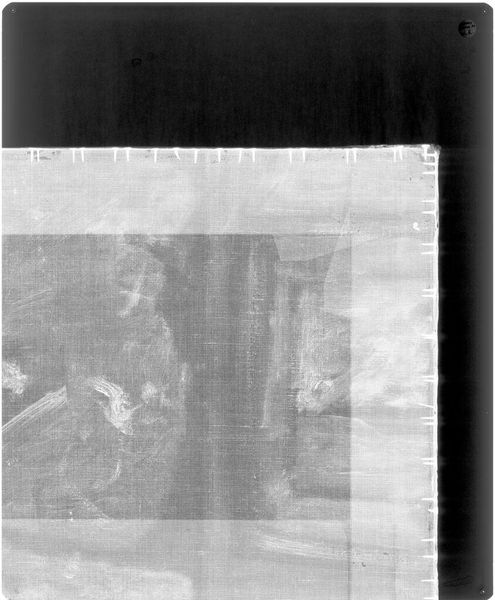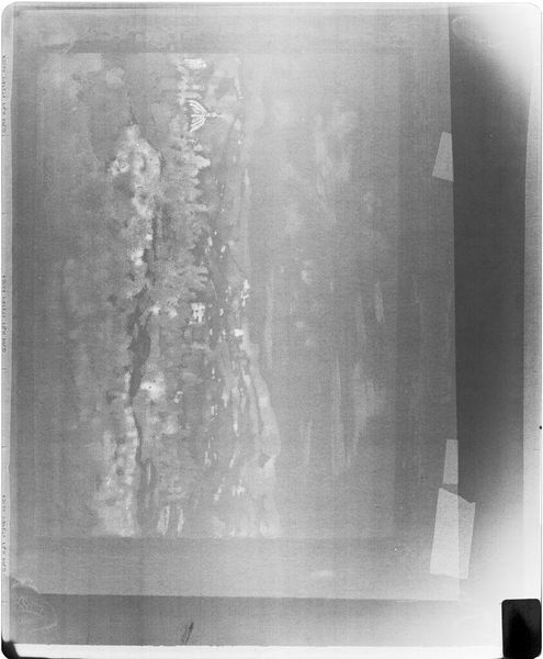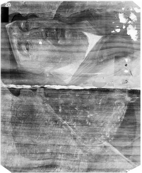 Curator: This is an X-radiograph of “Crucifixion,” an artwork by Guariento di Arpo, currently residing at the Harvard Art Museums. The film itself is about 8 by 10 inches. Editor: Eerie. It’s like looking beneath the surface, past the veneer of the visible. I see ghosts of forms, suggestive of deep secrets. Curator: Absolutely. The X-radiograph reveals the hidden layers, the very bones of the painting, its construction. We see the materiality, the process of its creation. Editor: And the iconography is still potent, even in this skeletal rendering. The stark image evokes sacrifice, loss, but also a kind of stark, enduring truth. Curator: The image challenges us to consider the labor and materials involved in creating sacred art, exposing the material processes behind spiritual iconography. Editor: The enduring power of the crucifixion image persists, even stripped bare to its elemental forms. Curator: Indeed. A potent reminder of the complex relationship between the visible and invisible, the sacred and the profane. Editor: Food for thought, seeing through surfaces like this.