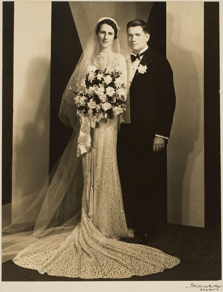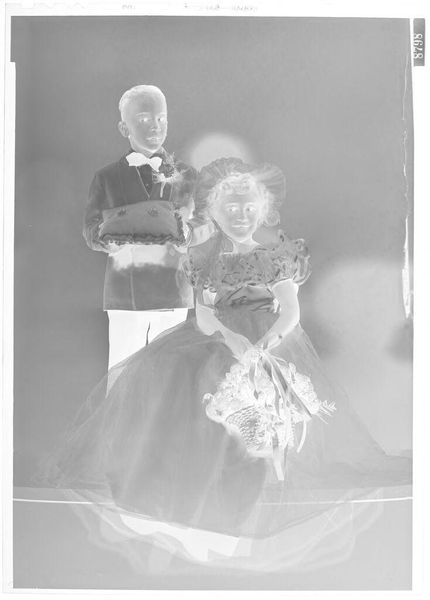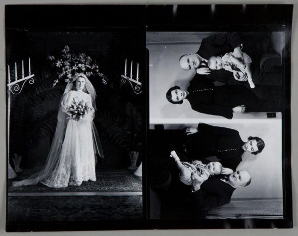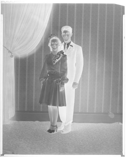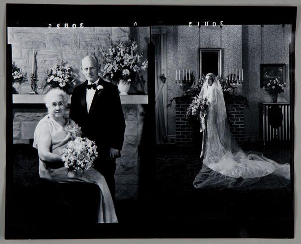 Editor: This is an untitled photograph by John Deusing, showing a bride and groom posing in a studio. It almost looks like a film negative. What stands out to you? Curator: I'm drawn to the way the material reality of the photographic process shapes the image. It's not just capturing a wedding; it's about the labor of producing this specific kind of document and its inherent materiality. Editor: So, you see the technique as part of the story? Curator: Absolutely. Consider the social context: studio portraits were a specific form of consumption and display. The chemicals, the paper, the posing - all contribute to a material record of a social ritual. What do you think about that? Editor: I never thought about the photo itself as an artifact, but I can see how all those details contribute to its meaning. Thanks!