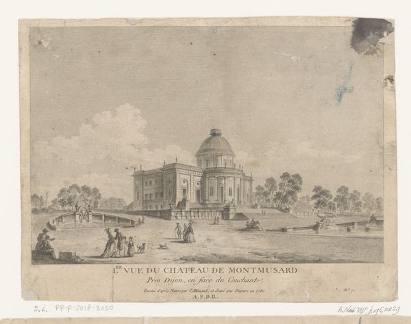 Curator: Let's examine "View of the Sint-Maria's Bridge in Utrecht." This ink drawing on paper, crafted sometime between 1825 and 1875, captures a bustling cityscape scene. Hendrik Wilhelmus Last is the artist. Editor: There’s such a delicate, tranquil atmosphere. It’s not just the subdued palette, but the carefully constructed balance of horizontal and vertical lines. The symmetry, the ordered architectural structures... it speaks of a desire for harmony, even amid the hustle of the everyday. Curator: Absolutely, I see it too. Notice the way Last utilizes perspective, drawing the viewer’s eye along the bridge towards the towers in the distance. The composition adheres to classical ideals, which emphasizes rational structure and a balanced viewpoint. The very architecture conveys stability. Editor: That central bridge seems quite symbolic, doesn’t it? Literally a link between places, but also perhaps representing connections between people, classes, or even different eras. These small figures are also very evocative. Curator: It serves its function literally and figuratively. What also interests me, in terms of formalism, is how the artist chose to delineate space. The intricate detailing of the bridge contrasts sharply with the relative lack of definition in the background foliage. This conscious manipulation of detail creates a subtle but powerful sense of depth. Editor: And look at how these families populate that foreground, though; tiny players in a larger symbolic narrative, their groupings seem meticulously posed, hinting perhaps at family values and societal norms. Their positioning relative to one another feels meaningful. Curator: Fascinating how he integrates elements of genre painting within this landscape, elevating an everyday urban scene into a statement on social life through design and visual storytelling. It suggests art has an imperative, beyond mere representational record, and extends an olive branch to its viewership to find it too. Editor: I concur. Last's "View of the Sint-Maria's Bridge" gives us a brief window into the Romantic-era experience. These are all small pieces which when seen together build a whole cultural context to the work itself. Curator: A fitting synthesis indeed. A successful attempt to decode structure and social function, it provides further evidence of this work's importance to the period.