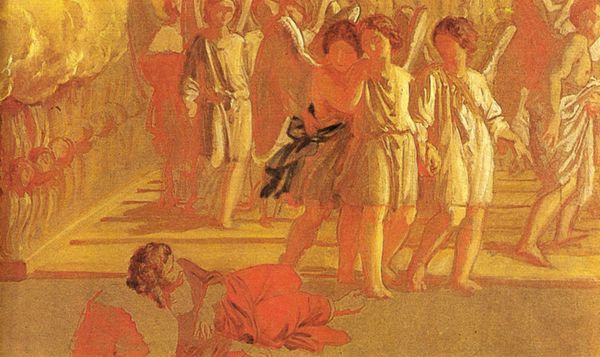 Editor: This is "Earthquake in the Crimea" by Kuzma Petrov-Vodkin, painted in 1928 using oil paint and gouache on a panel. The palette feels muted, almost drained, and there’s a tangible sense of unease in the figures’ postures. What's your take on this piece? Curator: The apparent stillness of the composition, ironically, speaks volumes about the underlying anxieties prevalent in Soviet society at that time. Petrov-Vodkin's social realism transcends mere representation. The earthquake isn't just a natural disaster; it’s a metaphor. Editor: A metaphor for what, exactly? The anxieties of Soviet Society? Curator: Yes. Think about the socio-political context: the forced collectivization, the suppression of dissent. The tremors experienced in the Crimea mirror the instability felt by many under Stalin's regime. Look at the figures, their faces are ambiguous. Their communal vulnerability renders visible the fissures of a crumbling social contract. Editor: The expressions definitely seem caught between fear and resignation, but the palette also really emphasizes that instability… Curator: Precisely! And the unusual perspective Petrov-Vodkin often employs further distorts our sense of reality, amplifying the psychological impact of the scene. Is it any wonder why many labelled this ‘Soviet Nonconformist Art’? Where do you find yourself positioned, relating to the figures represented in the frame? Editor: Considering its historical and social context makes it far more powerful than a simple disaster scene. Thanks for bringing that to light. It gives new meaning to "social realism" here. Curator: Absolutely. Viewing it through this intersectional lens opens a richer, more meaningful dialogue. It’s through understanding art’s dialogue with history that we come closer to perceiving our humanity reflected in a society of turmoil.