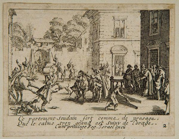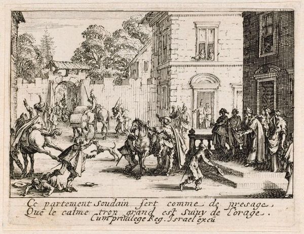 Curator: This is Jacques Callot's etching, "Killing of the Fatted Calf." It's a small work, just a few inches across. Editor: The scene feels bustling, almost chaotic. The composition is dense, packed with figures and animals. Curator: Callot, who lived from 1592 to 1635, meticulously rendered this biblical scene using etching. The lines describe the labor involved in preparing a feast. Editor: Yes, a feast laden with symbolism! The fatted calf, of course, signifies forgiveness and acceptance. The father’s open arms mirrored in the slaughter. Curator: And how Callot highlights the division of labor: some lead the animals, others prepare the meat, and still others observe. It speaks to social hierarchies and communal effort. Editor: The architecture in the background becomes symbolic too, representing hearth, home, community, or even a golden age of prosperity now that the son has returned. Curator: Indeed. Callot's etching presents a fascinating glimpse into 17th-century social dynamics through the lens of a biblical narrative. Editor: It shows how potent symbols, even in mundane labor, can create complex emotional connections.