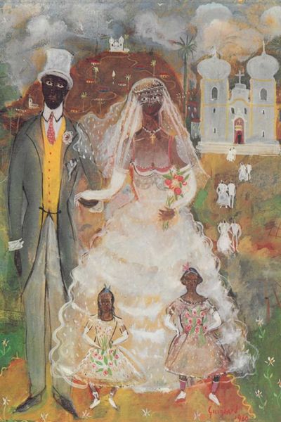 Editor: This is "Marriage on the Farm," an oil painting created in 1944 by Candido Portinari. I’m really struck by the solemn expressions of the wedding couple, almost melancholic. The palette feels muted except for their vibrant, white attire. What jumps out at you? Curator: The painting offers a window into the social realities of rural Brazil during a tumultuous period, specifically around World War II. It's worth asking how the imagery, like the dark complexion of the couple against their bright white clothing, was perceived at the time. What was the public role of representing marginalized communities? Editor: That's interesting. I hadn’t thought about the socio-political implications so directly. Do you think the “genre painting” aspect plays a part? Curator: Absolutely. "Genre painting," typically depicts scenes of everyday life. However, Portinari imbues it with an emotional depth and almost surreal quality. The small figures celebrating in the background juxtapose sharply with the larger, somber couple in the foreground. This could be seen as commentary on societal expectations placed upon marriage within a specific cultural context. Is this painting displayed publicly? Editor: Yes, and its presence invites viewers to question dominant narratives. It acts as a conversation starter on how historical representations either challenge or perpetuate societal power structures. The scale also seems to put focus on that cultural tension of societal expectations of a marginalized group of people. Curator: Exactly. Artworks like this become tools for public dialogue about uncomfortable histories. Portinari makes the viewers confront such power dynamics through a canvas. This kind of consideration for public access and how images are consumed is fundamental. Editor: That definitely gave me a new perspective on the work. Curator: I agree. It is imperative we acknowledge art's complex role in the social fabric of its time and how museums reinforce them now.