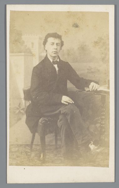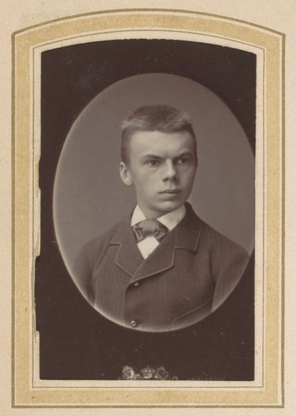 Editor: Here we have “Portrait of a Young Man,” a photographic work dating to 1871, by C. Janssens and E. Radermacher. The sepia tones give it such a timeless feel, and the subject's pose is quite striking. What stands out to you from a compositional perspective? Curator: The photographic surface displays a remarkable tonal range. Note the artist's skillful manipulation of light and shadow. How do you view the construction of space within the frame? Editor: It feels quite shallow, almost compressed. It's very focused on the subject, minimizing any background distractions. Does this affect how we should view it? Curator: Precisely. This concentration of the pictorial field serves to emphasize the sitter's physiognomy. Observe how the sharply defined contours contrast with the softer rendering of textures. It presents the photographic subject with striking directness. Editor: It's true, the texture in the hair versus the lapel of the jacket is something else. I suppose I wasn't paying much attention to those details. It's the overall mood that really spoke to me, it feels very serious. Curator: Are the darker tones balanced in a certain manner, perhaps within a geometric relation? Editor: Perhaps they anchor the lower corners and allow the gaze to rest on the face? Curator: Well considered. Editor: Okay, I see that the contrast really emphasizes the subject without background distractions. The different textures, now that I'm aware of it, provide much more detail than I first noticed. Curator: Yes. I found our exchange of views enriching as well.