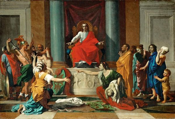 Here in the Victoria and Albert Museum is Raphael's 'The Death of Ananias', a cartoon conceived for tapestry production in the Sistine Chapel. The fresco is dominated by earth tones punctuated by the reds and yellows of classical robes. Its composition draws the eye from the rigid order of the figures on the raised platform to the chaos and terror in the foreground. Raphael masterfully uses perspective to create a palpable sense of depth, drawing us into the emotional core of the scene. Semiotically, the raised hand and direct gaze of the central figure are powerful signs of authority, while the contorted bodies on the ground signify submission and divine retribution. This spatial and gestural arrangement communicates a clear power dynamic, central to the work's narrative. Ultimately, Raphael uses formal elements to destabilize notions of justice and divinity, prompting us to question the relationship between power and faith. The use of line, color, and form elevates the cartoon beyond mere illustration, transforming it into a profound meditation on authority.