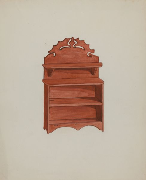 Curator: Before us hangs Leslie Macklem's "Corner Cupboard," executed circa 1939, rendered in what seems a confluence of watercolor and drawing. Editor: It strikes me immediately as quite domestic, in both subject and execution. A familiar piece of furniture depicted with, dare I say, loving care. Curator: Precisely. Notice how Macklem articulates the verticality and planar structure through parallel strokes of what appears to be charcoal and carefully controlled watercolor washes to model the surface's variations. It gives us a solid, geometrically assured form, despite the somewhat rough appearance. Editor: Yes, and those darker hinges, they speak to a craft tradition, and even a certain folksiness. Corner cupboards themselves occupy liminal spaces – corners – filled with objects that hold personal significance. Are we meant to consider the psychological implications of this piece through the objects it would likely hold? Curator: An intriguing suggestion. Consider too the repeated curved profiles found within. From a purely structural perspective, each shelf establishes a recessional plane – an arrangement mirroring the opening arch at the piece’s crown. This visual echo introduces complexity within an ostensibly simple, utilitarian design. Editor: I agree, it isn't merely functional. Macklem is subtly reminding us that even mundane objects have symbolic resonance. Think about the colors selected; the varying red and brown tones evokes not just the material of the cupboard but also the passage of time, the warmth and the associations connected to this very object. Curator: The artist successfully navigates between mimetic representation and subjective interpretation. While anchored to observable reality, Macklem is very subtly manipulating space with his subtle modulations of tone. He provides just enough information for the viewer to infer depth, volume, and texture without explicitly illustrating every minute detail. Editor: A tender portrayal imbued with layers of cultural history. This humble cabinet then acts as a reminder of our connections to both past and future. It becomes not just furniture, but a repository of family memory. Curator: A meticulous orchestration of simple elements, producing surprisingly effective dimensionality. The very definition of ‘ordinary made extraordinary.’