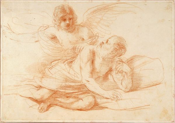 Antonio Bellucci’s study, “Wollust verführt einen Genius,” presents a powerful allegory with a winged male figure symbolizing genius, succumbing to the embrace of Wollust, or lust. The genius, a figure of intellect and inspiration, is entwined with a figure representing desire. This scene evokes the ancient motif of the "Judgment of Hercules," seen in Roman frescos, where the hero must choose between virtue and pleasure. The wings, traditionally symbols of spiritual aspiration, here seem weighed down, suggesting a fall from higher ideals. Consider, too, the ubiquitous image of Cupid and Psyche. In that tale, Psyche's downfall comes from her own curiosity and desire, echoing the theme of intellect undermined by passion. These images reveal the recurring human drama of navigating reason and desire. The raw emotion captured in Bellucci's sketch strikes at the heart of our own subconscious struggles, reminding us that the path of genius is often fraught with the temptations that test the limits of human will.