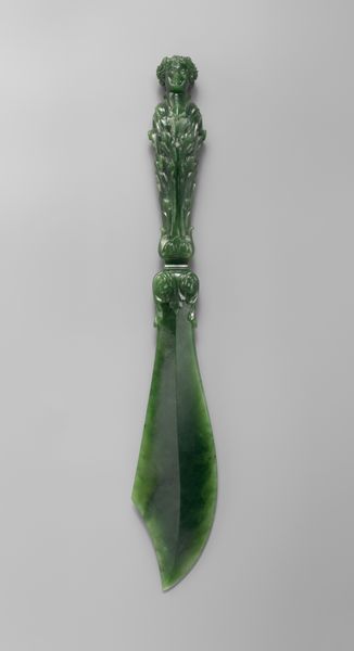 Editor: Here we have what's identified as "Mere Pounamu" by an unknown Māori artist, its date also unknown. It appears to be a sculpture made from some type of greenstone and what strikes me immediately is its almost hypnotic smoothness. What do you make of it? Curator: As an object of cultural heritage, "Mere Pounamu" speaks volumes. Beyond its aesthetic appeal and expert craftsmanship, this carving represents a convergence of artistic skill, material significance, and cultural power within Māori society. I see a carefully fashioned object reflecting the history of its ownership and the traditions surrounding its use. Have you thought about that history? Editor: I have not! Can you tell me more? Curator: Mere were not merely decorative items. They were weapons, badges of rank, and significant taonga – treasures carrying ancestral mana, or spiritual power. To truly appreciate it, we must consider the social institutions that both produced and were reinforced by such objects. Who held them, and under what circumstances were they displayed? Editor: So, looking at it, we are really seeing the tip of the iceberg – or perhaps, more aptly, only the polished surface of something that runs far deeper? It's less about simple aesthetics, and more about a narrative woven into the greenstone itself. Curator: Exactly. Consider how museums themselves influence our understanding. We display it respectfully behind glass, but the full story of its movement through time, different hands, and diverse contexts can become obscured. Editor: That's such a helpful way to reframe it. I'll never look at indigenous art the same way again! Curator: And hopefully you will remember to see how intertwined that artwork is within the system surrounding it.