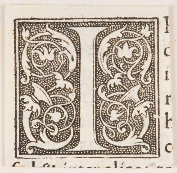 Curator: This intriguing initial, simply titled "Letter I", resides in the Harvard Art Museums and its creator remains anonymous. It's visually striking. Editor: Yes, it strikes me with its intense contrast. The ornate white letter form surrounded by dense, dark foliage gives the piece a dramatic, almost heraldic feel. Curator: I'm fascinated by the labor involved, particularly given its likely function within a larger printed work. Think of the skill and time required to produce the block for printmaking, likely wood. Editor: The composition is cleverly balanced, with the "I" acting as a central anchor for the swirling organic motifs. Semiotically, the letter itself promises structure and order, even as it's enveloped by chaos. Curator: Exactly! It’s blurring the lines between craft and art production. The intended use – to adorn a page, to facilitate reading – highlights the material conditions of early book production. Editor: Still, the artist's focus on form and visual interest is clear, wouldn't you say? The density of the pattern and the rhythmic repetition create a unique aesthetic experience. Curator: Perhaps, but what elevates it is the context – that is, its place within a social and material network of production. Editor: Well, regardless, it's undeniably captivating. I find my eye drawn back to the crispness of the central 'I' again and again. Curator: I agree. The piece speaks volumes about the means of production of the time, and how these items shaped knowledge transfer.