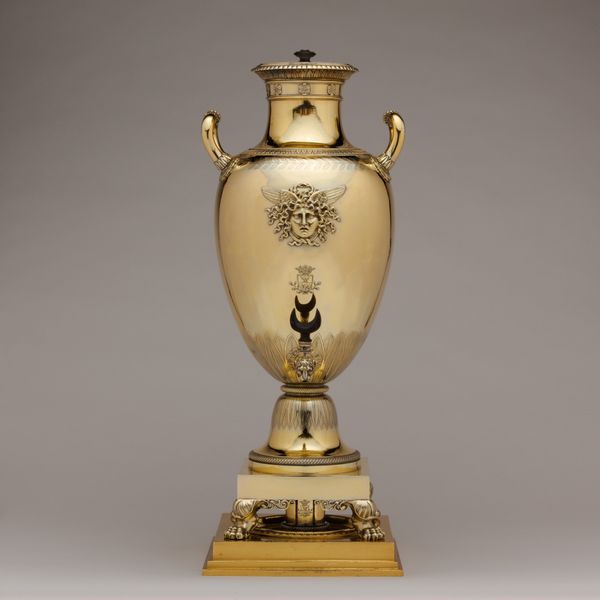 Curator: Ah, a beautiful piece. This is an urn, crafted by Henry Chawner, who lived from 1750 to 1850. Editor: It's so...contained. Like a silver tear about to spill. That dark green spigot only amplifies the feeling. Curator: The urn, a symbol of mourning and memory, evolved over time. It became less about ashes and more about stylish serving. Think of punch or, dare I say, a potent spiced wine. Editor: Yet the material resists easy comfort. The coolness of silver paired with that very formal, almost heraldic, crest...it feels distant. Curator: True, the crest suggests a very specific lineage, a family’s story etched in metal. This object broadcasts status and refinement. Editor: It’s interesting how functional objects can carry such loaded symbolism. The weight of history, quite literally, in your hands. Curator: Yes, a silent witness to gatherings, secrets, and perhaps even heartaches. It’s a tangible echo of lives lived. Editor: It’s elegant and melancholy all at once.
