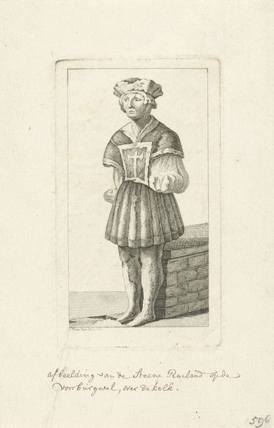 Curator: Standing before us is “De exercitie met de targe en rapier: de soldaat brengt de targe van de rug over de linkerschouder (nr. 2)", dating from 1616 to 1618, by Adam van Breen. It’s an engraving, rendered on paper. Editor: There’s an undeniable tension in this Dutch Golden Age piece. The monochrome palette highlights the soldier’s burdened posture as if he is captured in a moment of weariness rather than martial prowess. It whispers a story of constant preparation. Curator: I think you have intuited the intent. The work presents the viewer with a technical demonstration – notice how the numbered title explicitly frames this artwork as part of a manual. What semiotic inferences can be drawn from the soldier’s armour, his positioning, the angles? The artist captures the subject in mid-motion as the shield is brought forward. It’s less about the man himself and more a study of the components and movements that go into the military art of combat during the early 17th century. Editor: You're right, there is something emotionally removed from the representation; the details seem prioritized above a complete impression of human form. It's a baroque rendering that highlights the weight of duty, the geometric puzzle of defense. The subject's world consists of targe, rapier, and endless drills. I wonder if it might be a comment on the burdens placed on soldiers by Dutch society at this moment. Curator: I wonder... The visual language presents the subject simultaneously in terms of instruction and fine art. We appreciate the shading, cross-hatching, and gradations of tonality in relation to its practical purpose. Look closer; there is damage. And yet the piece persists, with lessons still to impart centuries later. Editor: Well, I’m struck again by the quiet humanity captured in the piece – in that burdened stance – technical exercise or not. It lingers with me in a very particular way. Curator: I concur. Though technically focused, Breen has created something much more.