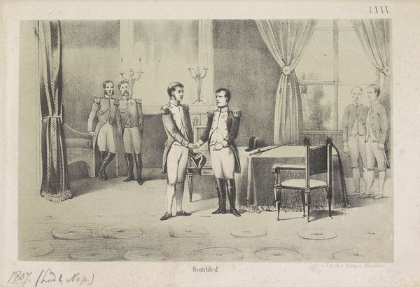 Abraham Vinkeles made this print in 1813, depicting Jacob Fagel and Hendrik de Perponcher meeting the Prince of Orange in London. Produced during a period of significant political upheaval in Europe, the print implicitly comments on the shifting power dynamics of the time. The Netherlands was under French rule, and the Prince of Orange was in exile in London. The meeting suggests a moment of diplomatic maneuvering, a sign of the Dutch bid to restore independence. Prints such as this played a crucial role in shaping public opinion and national identity. They were relatively accessible and easily disseminated, making them powerful tools for political communication. The image also creates meaning through the architecture of the location - a high class well decorated building - which evokes the legitimacy of royalty and diplomacy. To fully understand its meaning, further research into the political context of the time is required. By studying diplomatic records, newspapers, and other primary sources, we can gain a deeper appreciation for the print's significance as a historical document.
