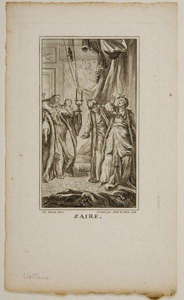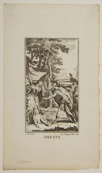 Editor: So, this is Pierre Louis Surugue’s print, “Orestes.” I’m struck by the tension. It feels like a pivotal moment, a confrontation of some kind. What do you see in this piece? Curator: It’s a powerful depiction of a classic story, isn’t it? Consider the historical context: How does Surugue engage with the themes of justice, revenge, and the role of women in this scene? Is he challenging or reinforcing societal norms through his portrayal? Editor: That's interesting. I hadn't thought about the gender dynamics. Curator: Exactly! Think about the gaze, the power structures implied in their body language. How might a feminist reading of this image reveal deeper layers of meaning about agency and oppression? Editor: I see what you mean. Thinking about it that way really opens up the work. Curator: Precisely. Art becomes a mirror reflecting and refracting societal issues across time.