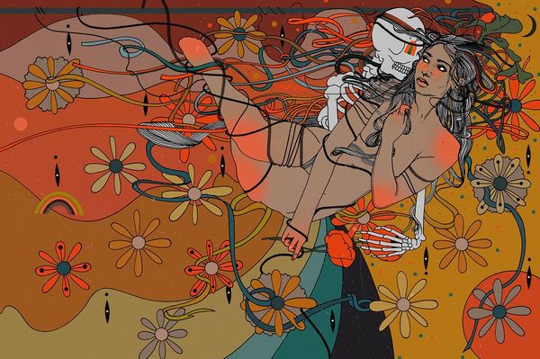 Curator: Here we have Andrey Remnev's 2017 painting, "Bronislava", created using acrylic paint. Editor: It’s…dreamlike. A very subtle color palette, dominated by golden yellows. A definite sense of surreal beauty, but also a strangeness, something almost unsettling about the composition. Curator: Indeed. Note how Remnev has constructed the central figure. We see both a defined, realistic face adorned with this rather baroque headpiece, and an adjacent faceless form in a warm peachy hue, filled with further decoration. Editor: This striking contrast begs questions about constructed identity. Who is Bronislava, and which aspects of her are visible or hidden? The realistic face, juxtaposed with the silhouetted form, immediately introduces themes of performativity, particularly relevant in analyzing women’s lives and the constraints placed upon them by societal expectation. Curator: Intriguing. And yet, formal analysis also reveals an undeniable balance in the arrangement. The silhouette functions as a framing device, guiding our gaze towards the precisely rendered details like the frilled fabric of the headpiece. Consider, too, how the owl, birds, and trumpet flowers are distributed. The artist maintains a planar composition without resorting to depth or shading in a conventional manner. Editor: Absolutely. And that brings us to the significance of the backdrop. It almost reads as distressed wallpaper, and serves as both grounding and contrasting layer for Remnev’s subjects. The flying birds introduce ideas of freedom and transformation, even while the more ornamental elements suggest constriction. It speaks volumes. Curator: What do you think viewers take away from a modern, technically accomplished artwork such as this? Editor: I think "Bronislava" prompts a critical discussion around identity, representation, and the often invisible forces shaping our self-perception. Curator: Precisely. Its deceptive simplicity conceals remarkable complexity, demanding multiple interpretations. Editor: Art indeed invites inquiry and expands consciousness in unpredictable ways.