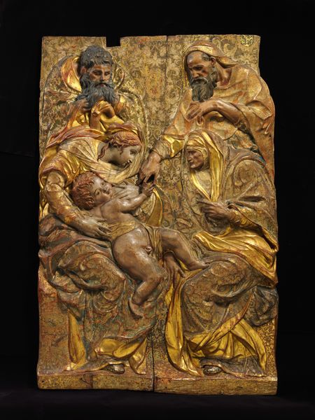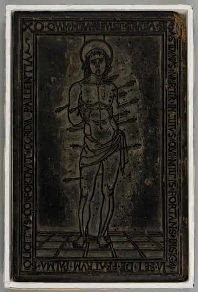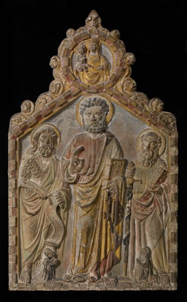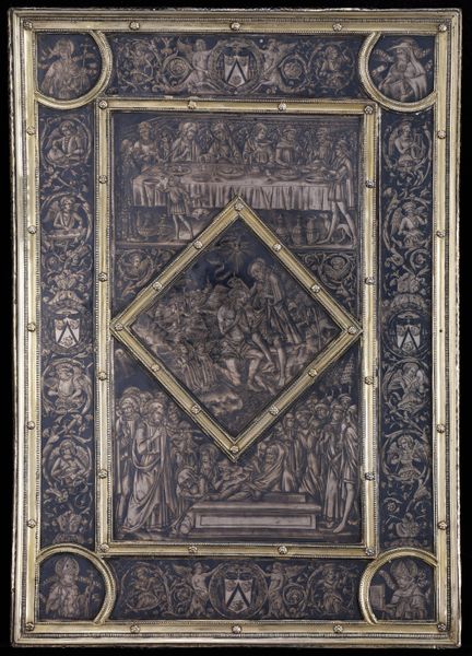 Editor: This is Bartolomeo Bellano's bronze relief, "The Dead Christ with Two Angels". It's a striking piece, very somber and moving. The texture of the bronze is so tactile; you just want to reach out and touch it. What strikes you most about this work? Curator: Oh, the pathos practically sings from the bronze, doesn't it? I'm drawn to the quiet intimacy, despite the monumental subject matter. Look at the angles of the figures, their tilted heads and joined hands...What story do *they* tell, beyond the obvious sorrow? Editor: I guess I see them as witnesses to Christ's suffering. Maybe even mourners? Curator: Precisely, but look closer. Their gestures are not just sorrow, are they? Isn't there a curiosity mixed in, perhaps even a dawning awareness? They are present and contemplating what lays before them. The cross in the background feels secondary to this intimate drama, don’t you think? I find myself wondering what the artist aimed for. He wasn't making a 'scene' out of it, he was creating a reflective mood! Editor: That's true, the figures do seem very inward. And you're right about the cross taking a backseat. I was so focused on the emotional impact of Christ’s figure that I almost missed the curiosity in the angels' expressions. I love how the use of bronze adds to the serious feeling this piece gives off. Curator: I can now imagine this piece positioned within a darkened chapel space. A golden, somber moment within this artwork, inviting the viewer into a silent contemplation. Editor: Thank you, that really opened up the way I perceived it!