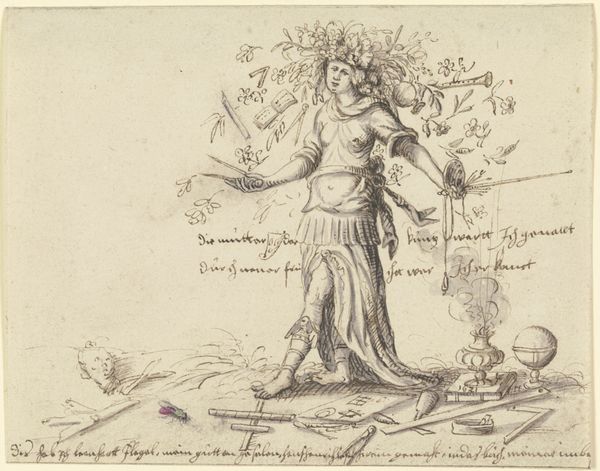 Curator: Daumier's 1869 lithograph, "La Partie de Volant", offers a satirical commentary on the delicate dance between war and peace in Europe. Editor: It's stark. The way the figures are positioned suggests a push and pull. It’s unsettling. Curator: Note how Daumier uses the visual language of classical allegory, drawing on familiar tropes of Peace and War. Peace, on the right, with her olive branch, is set against War, armed with a spear. It becomes more interesting when seen within the longer history of such allegories. Editor: Interesting that he puts the words, the actual text labels on them. Do you think that maybe speaks to who his intended audience was? The broader population perhaps wouldn't know these allegorical representations as easily as someone in power. Curator: Precisely. These archetypes were used in academic painting, sculpture, popular prints, emblems, etc. The game of badminton, which could be compared to how "Volant" can also refer to flight or momentum, becomes a symbol for the precarious balance between these forces, especially when taking into account the history that led to the Franco Prussian War and its lasting impact. Note the "Europe" in gear-like machinery. Editor: I find it cynical, that Daumier has given it this title like a polite game of badminton but underneath, it is quite literally weaponized in this depiction. It also critiques Europe as a machine churning with conflict. There are very strong activist critiques being put on display. Curator: Yes, Daumier presents us with something more complex than a simple opposition. In the expressions, and the compositions that each actor performs on the stage of international politics and tensions, we observe not binary opposites, but rather points on a spectrum. Editor: Looking at it now, the piece reads more like a perpetual state, with both powers locked in endless competition instead of simply "War versus Peace." The fact that it is always happening feels quite sad and true. Curator: The symbolism gives this print a lot of nuance. The lasting power of these images lets them keep influencing viewers, making sure the discussions continue. Editor: Definitely something to ponder about, it still continues to make a valuable intervention into contemporary discourse.