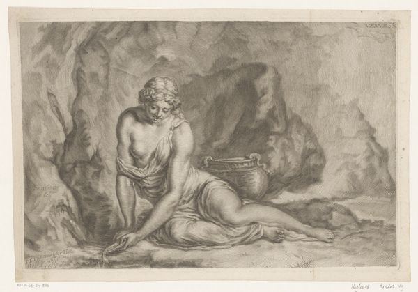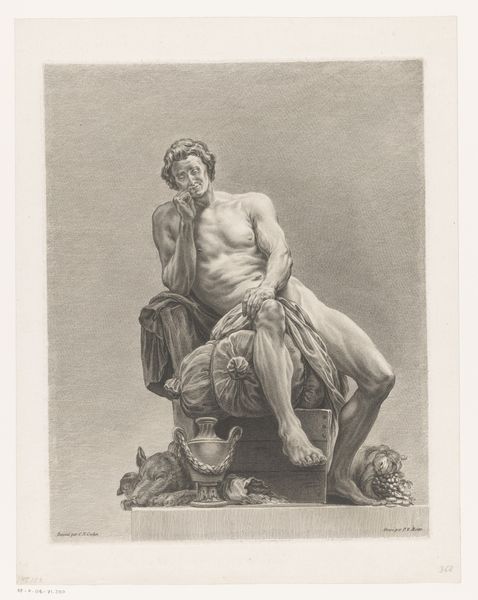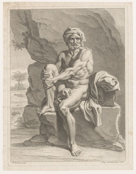 Curator: Here we have Johann Elias Ridinger’s 1728 etching, “Zittende krijgsman met ontblote borst,” which translates to “Seated Warrior with Bared Chest.” It’s part of the Rijksmuseum’s collection. Editor: The first thing that strikes me is the line work—it's so delicate, yet creates such a muscular figure. He looks utterly defeated. Curator: Ridinger was known for his animal studies, particularly horses, but he also produced many allegorical and historical prints. This piece showcases the Baroque era's fascination with classical antiquity and the male nude. He has a laurel wreath so it looks like he has divine status or kingship. Editor: I'm curious about the physical process of creating this image. You can almost feel the pressure of the etching tool as it bit into the metal plate. How would the labor of this print compare with a commissioned portrait from the period? The intended audience certainly differs. Curator: Good question. The print medium makes the artwork more widely available than, say, a unique painting. Its accessibility allowed for the spread of certain ideas, or ideals like in this print. The mass production through printmaking democratized the image, shaping public taste and disseminating propaganda. Editor: The social context shapes my view of the work. To our eyes, this seems like an idealized or possibly homoerotic nude, but maybe this man stands for loss and lament—like some biblical character brought low through hardship. Curator: Absolutely. Prints such as this, during the rise of academies, allowed for the transmission of artistic ideas and for artistic training, especially with the study of anatomy. The work speaks of history painting and moral lessons—valor lost, perhaps? Editor: Right. Thinking about the etching process and the warrior’s bare chest, the making of this print isn’t too dissimilar from how that man may have once dressed or armed for war: through successive layers and a lot of physical, demanding, hand-to-object work. Curator: What a compelling observation! Viewing it this way makes you realize that while Ridinger depicted a warrior, his work participates in the culture that idolizes militarism, even after conflict has destroyed it. Editor: It really opens up what we're seeing—an intricate network of manual labor, the printing press, classicizing, artistic styles, and public reception all coalesce. It’s more than meets the eye at first glance.