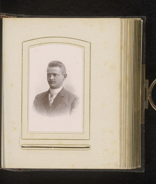 Curator: Here we have an intriguing example of late 19th-century portraiture, titled "Portret van een jonge man," dating approximately between 1856 and 1889. The medium involves an albumen-print or a gelatin-silver-print on paper. Editor: The sepia tone gives it such a wistful aura. The sitter's gaze seems directed both at us and inwardly. I notice the framed oval and how it nestles into the larger rectangular format of the page. Curator: Indeed. Photography in this era served as a vital tool for solidifying middle-class identity. This young man's dress, his suit, the subtle suggestion of status, speak volumes about the aspirational values of the period. What can be assumed about access and privilege with photographic technologies then becoming widely, though not universally, accessible? Editor: Visually, there’s a wonderful play between soft and hard edges. The way the rounded frame emphasizes the gentle curves of the man's face juxtaposed with the angles of the background is particularly effective, drawing my eye right to the sitter's gaze. And observe the graininess— a reminder of photography's chemical process and its own temporality. Curator: Consider too, the likely dynamics of the photographic encounter. He isn’t captured spontaneously, rather his pose and demeanor would have been directed with the sitter attempting to capture and cement something lasting, representative. How does this performance of the self influence contemporary expectations surrounding masculinity and image? Editor: Thinking about photography through a lens of structuralism really draws forth a consideration of its binary codes of realism and representation, illuminating the formal artistic conventions and societal contexts woven into a visual fabric. Curator: Precisely. And through these analyses, hopefully we’ve encouraged a look at photography not just as aesthetic document, but as something far richer— an image imbued with the politics of personhood. Editor: And with it, a heightened appreciation for the photograph’s compositional decisions, its interplay of textures and light—its own mode of visual poetry.