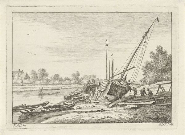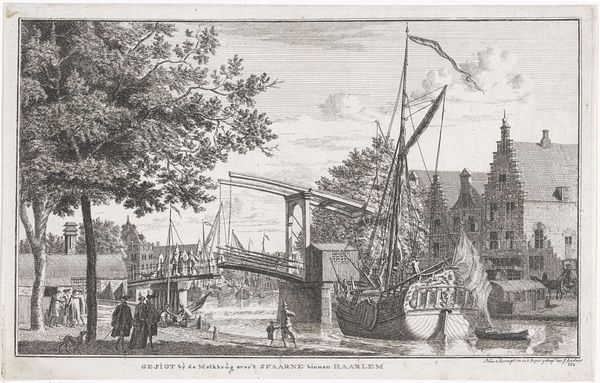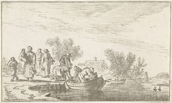 Editor: This is Jan van Almeloveen's "Gezicht op Groot-Ammers," made sometime between 1662 and 1683. It's an engraving, giving it a very linear, almost delicate feel. It’s a peaceful scene, with figures in a boat and a quiet town in the background, but the details feel a little... mundane? What do you see in this piece? Curator: The perceived mundanity is precisely where the power of Dutch Golden Age landscapes lies. They appear simple, bucolic, yet they're deeply interwoven with the complex socioeconomic fabric of the time. This scene isn’t just a pretty view; it represents the intimate connection between the Dutch and their waterways, crucial for trade and prosperity – and also, significantly, for defence and control in a society marked by both wealth and constant struggle for independence. How do you think that reading changes your experience? Editor: I see what you mean. Knowing the context adds layers. I initially saw two anonymous figures in a boat, but now they represent something bigger – a working class that facilitated Dutch power. Does the specific location, Groot-Ammers, also carry some of that significance? Curator: Absolutely. While perhaps not a major trading hub like Amsterdam, Groot-Ammers reflects the decentralized nature of Dutch power. The details of the print, down to the specific architecture of the church, represent local identity, local pride, but also the ubiquity of a shared Dutch identity linked through water and trade. This engraving then operates on many different levels, simultaneously expressing individual and national narratives of progress and hard-won liberty. Editor: So it’s both a realistic landscape and a representation of Dutch identity. I hadn't thought about that initial read, or how important understanding the historical moment can be. Curator: Exactly. And perhaps consider next time how elements of gender and race further complicate how identity and narratives of freedom are expressed in visual culture! Editor: Thanks. That really broadened my perspective on Dutch landscape art. I see so much more in it now!