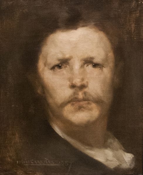 Curator: I’m immediately drawn to the melancholy hanging around Eugene Carrière's "Self-Portrait" like a fog. The way the colors melt together feels almost… sepulchral? Editor: Indeed, the piece, painted between 1888 and 1898, definitely utilizes a muted palette to achieve that very feeling. Looking at it closer, the man emerges, quite literally, from a haze of earthy browns and beiges. Curator: Like a spirit trying to materialize! It makes me wonder what was going through Carrière's head as he worked. I can practically feel him grappling with mortality and maybe even the fleeting nature of identity. Editor: Given Carrière’s interest in the symbolist movement, I wouldn't be surprised if that were precisely his intent. Notice how his face isn’t rendered with stark detail but softened with blended brushstrokes—almost dreamlike. This obscures a definitive understanding and adds to the piece's psychological weight. Curator: So, the softness itself becomes part of the message? It's almost as if he is hinting at the self as something intangible. This impressionistic style employed with oil paint just elevates the canvas beyond a mere likeness; it transforms it into a mirror reflecting the anxieties of his time. Or maybe any time! Editor: Precisely. His work also captures a longing and melancholic resignation quite common near the end of the 19th century, a sentiment known in German as weltschmerz, literally "world-pain." Curator: And it echoes even now! Knowing it is held in the collection of The Metropolitan Museum of Art, one can sense how these painted emotions travel across lifetimes to stir similar sentiments in new observers. What's more, that direct gaze is incredibly compelling; you get a strong feeling that Carrière wants you to *feel* him. Editor: It serves as an excellent reminder that visual imagery and, in particular, portraiture serves not merely as a mirror of physical likeness, but instead, acts as a cultural container of lived experience across time. Curator: And that’s what makes it all so timelessly human, even as the colors fade.