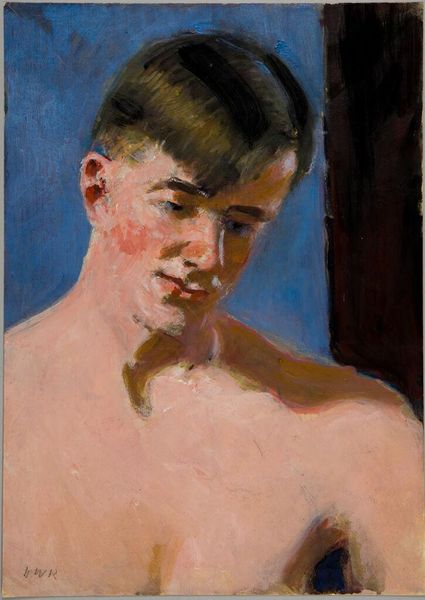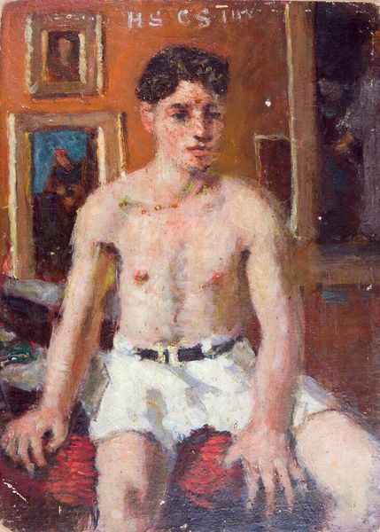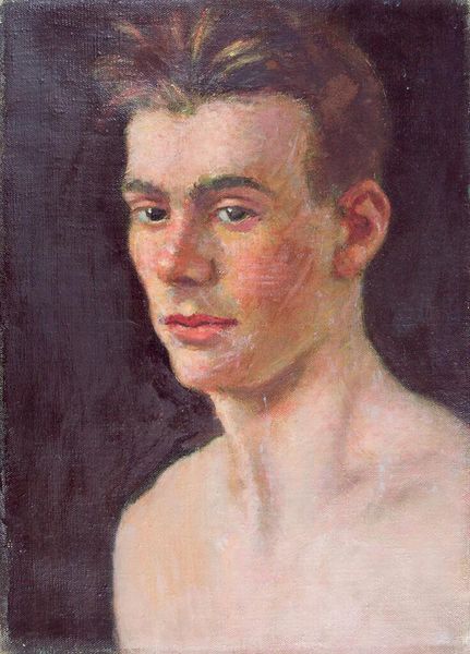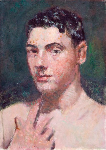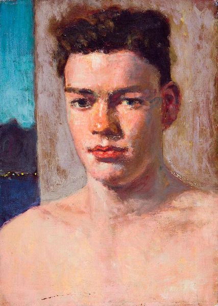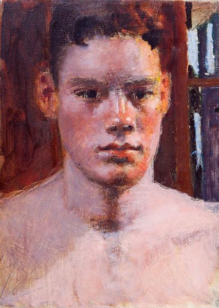 Curator: Let's turn our attention to Denman Waldo Ross's “Portrait of a Young Man with Mirror and Painting,” currently residing at the Harvard Art Museums. Editor: It's a surprisingly intimate piece. The brushstrokes feel incredibly immediate, almost feverish, especially around the face. I'm curious about the canvas; it has a coarse texture. Curator: Indeed. Ross, active in the late 19th and early 20th centuries, was deeply involved in the Arts and Crafts movement. This portrait, though seemingly simple, reflects the movement’s emphasis on handcrafted beauty and the dignity of labor. Editor: The mirror and painting in the background feel significant. Is it about artistic self-reflection? A kind of meta-commentary on art's role in society? Curator: Possibly. Ross was also a scholar of aesthetics and design. The artwork could be a commentary on the role of art in shaping perceptions. Editor: It’s compelling to consider how the rough materiality contrasts with the delicate subject matter. It seems almost like a statement of intent, perhaps, on the nature of artistic creation. Curator: His work certainly invites questions about how we value both the subject and the means of production in art. Editor: It makes me think about art's accessibility, or lack thereof, and how movements like Arts and Crafts attempted to bridge those gaps. Curator: Exactly. Ross's portrait provides a great lens for exploring these complex themes.