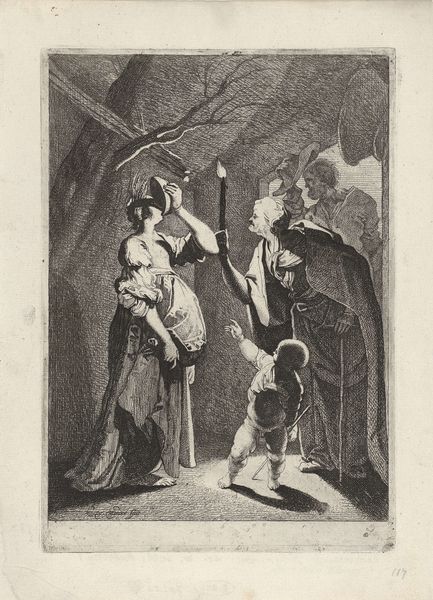 Daniel Nikolaus Chodowiecki made this etching, called The Voyage to Paris. Etching is a printmaking technique, one of the oldest and most adaptable of graphic art processes. Using this method, lines are incised into a metal plate with acid. The plate is covered with a waxy layer, and then the artist scratches away the wax to expose the metal, before bathing it in acid. The longer the plate is exposed to the acid, the deeper the lines will be, and the darker they will appear when printed. The image shows a woman packing for a trip, watched by two other figures. The scene is domestic and rendered in intimate detail. The fine lines of the etching allow for a great deal of detail, capturing the textures of clothing, the grain of the wood, and the fall of light. Chodowiecki expertly employs these subtle variations, creating a captivating and highly reproducible image. The print medium allowed his work to circulate widely, a distinctly modern phenomenon, breaking down traditional boundaries between fine art and craft.