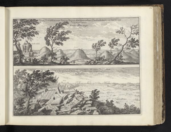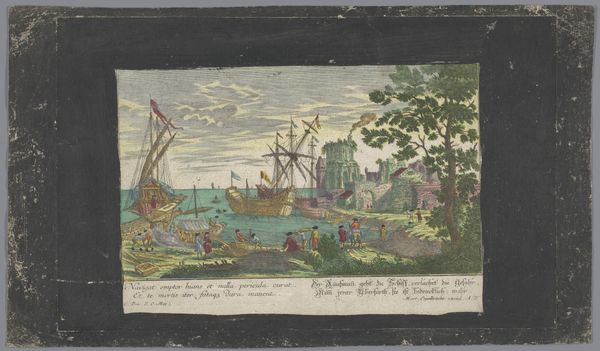 Editor: This watercolor painting, "Gezicht op het vertrek van twee schepen," dating from 1708 to 1756 and attributed to Martin Engelbrecht, features two ships departing. It’s housed here at the Rijksmuseum. It strikes me as quite detailed, almost like a meticulously documented scene. What visual stories do you see embedded within this image? Curator: Look at the plume of smoke and ask yourself "What can this symbolize?" The ships are the obvious focal point, promising trade and connection, of course, but the smoke? Could it be farewell shots? The power of trade is a complicated legacy that connects cultures, as represented by the ships juxtaposed with the foreign looking landscape to the right; while destruction looms in the background. Editor: I see what you mean! The fort with cannon suggests maybe there's danger involved in this supposed trade and prosperity, but I initially thought the image simply communicated exploration. The visual language almost feels deceptive now! Curator: Precisely! It’s important to consider what cultural memory is encoded here. Even the colors contribute; muted watercolor, colored pencil; all tools of a recorder. It is a depiction but an illustration or a scene – whose scene? A psychological snapshot! Editor: That makes sense. It shifts the entire meaning from a celebration to a careful observation with inherent judgement. Thank you, I'll definitely look for those cues in other Baroque landscape paintings too. Curator: Remember, the language of imagery is ever-evolving. Question what you know to see deeper and know the culture that built that knowledge.