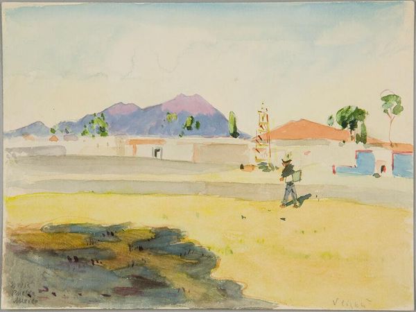 Editor: This is John Lavalle's "Agua from El Calvario, Antigua, Guatemala" painted in 1950, appearing to be primarily watercolor. I'm really drawn to the way the light seems to define the shapes of the architecture. How would you interpret this work? Curator: I immediately consider the materials and labor embedded within. The watercolor itself, its accessibility as a medium in the mid-20th century, speaks to the artist's position and access to resources. Even the depicted ox cart—think about the physical labor required to build it and the animals’ role in transportation. How does that influence your understanding? Editor: That's interesting! I hadn't considered the ox cart beyond its visual contribution to the composition. So, you're saying the painting itself, because it is watercolour, positions the artist within the means of production? Curator: Precisely. Watercolor allowed for quicker execution and portability, hinting at a more immediate, documentary-style engagement with the scene. Then, compare this with the monumentality of the church rendered using what may be local materials; you've got a visual tension setting social layers against one another. What does that contrast evoke for you? Editor: I see what you mean. It adds a layer of commentary about everyday life juxtaposed with the enduring presence of the church. Thinking about the handmade nature of both the oxcart and painting really changes my perception. Curator: Right, and handmade means embedded labor, intentional choices, and cultural context reflected through those choices. It highlights value, even in what might be overlooked in favor of traditional high art subjects. Editor: I hadn't thought of that, considering the materials and process. Thank you, that shifted my perception quite a lot. Curator: Indeed! Examining the 'how' and 'what' things are made from unveils unseen layers of meaning and socioeconomic relationships embedded in this, and every work of art.