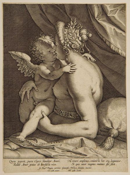 Editor: This is Michele Bisi's "Venus and Cupid," made sometime in the late 1700s or early 1800s. It's a detailed print, and the figures feel so soft. What can you tell me about the materiality of this piece? Curator: Well, consider the labor involved in creating such a detailed print. The artist used metal plates, ink, and a printing press. The process inherently industrializes art making and democratizes imagery, creating a commodity for a consuming audience. Notice how the artist skillfully rendered flesh and drapery using only line and tone. This elevates the printed image, challenging the traditional hierarchies separating fine art from commercial production. Editor: So, the act of printing itself changes the meaning? Curator: Exactly. The act of reproduction transforms a unique artwork into a multiple, impacting its value and accessibility, and influencing social perceptions. What implications does this have on the perceived value of "high art," and the function and commodification of the image in 19th-century society? Editor: That's really interesting. I'll definitely think about the printing process differently now!