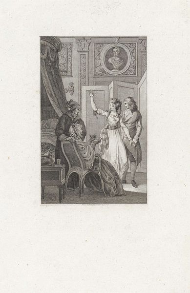 Reinier Vinkeles created this etching, "In een gezelschap wordt een man de deur gewezen" sometime between 1741 and 1816, capturing a dramatic moment within a gathering. During Vinkeles' time, societal norms heavily influenced art. This piece offers a glimpse into the rigid structures of class and social conduct. The scene portrays a man being forcefully ejected, likely due to a breach of etiquette or social decorum. The expressions and gestures of the surrounding figures convey a mix of shock and disapproval, revealing the importance of maintaining appearances and adhering to unspoken rules. Consider the power dynamics at play: Who holds the authority to cast someone out? What does it mean to be an outsider looking in? Vinkeles invites us to reflect on the personal and emotional consequences of exclusion within a society that valued conformity.
