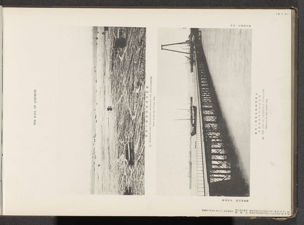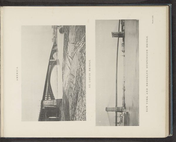 Editor: The image possesses such a stark contrast; one can sense an aura of historical depth emanating from this print. Curator: Precisely. This plate showcases two landscape photographs dating from before 1890, rendered as prints. We have here the "Runcorn Bridge, near Liverpool", juxtaposed with the "Clifton Suspension Bridge over the Avon." Editor: The depiction of the Runcorn Bridge feels almost industrial. The architecture itself and surrounding structures evoke a landscape shaped by manufacturing, even transportation. I find myself thinking about the workers, the building, the soot involved. Curator: A very interesting perspective. But from a formal standpoint, note how the geometric forms of the bridge and supporting architecture play against the organic textures of the natural environment surrounding the site. The composition is carefully balanced; the bridge acts as a horizontal axis which then leads the viewer’s eye into the background, a strategy often employed to represent visual depth and three-dimensional space within two-dimensional confines. Editor: That balance extends into considering photography and print making technologies of the era. From my viewpoint, understanding the specific alchemy of the photographic print is integral to unlocking how that technology alters representations of progress and industry. It transforms mere matter and production into image. Curator: And the juxtaposition amplifies this point. The Clifton Bridge, depicted here as receding elegantly between the hills and towards the sky. Editor: Right, a sense of scale and also potential. By depicting these achievements, these industrial achievements, these images actively shaped cultural perception around technology and social advancement. Curator: I concur. The sharp contrasts create visual interest but simultaneously invoke, especially with its grays, ideas related to scale and power that could then contribute to collective interpretations related to engineering, modernity and progress. Editor: These older pieces are so suggestive, full of latent implications surrounding human development and natural exploitation that continues to provoke reflection, don’t you think? Curator: Indubitably. Considering the form, the photographic approach as an artistic composition provides insights into understanding of the past and technology of its era.