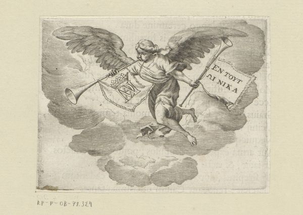 Curator: Alexander Ver Huell, a Dutch artist, possibly created this drawing, rendered in ink on paper, between 1864 and 1866. The artwork is titled "Vader Tijd pakt vluchtende mensen op en stopt ze in een mand," which translates to "Father Time picks up fleeing people and puts them in a basket." Editor: The initial impact is haunting, yet thought-provoking. It feels like a visual elegy—a somber landscape dotted with potent symbols, rendered in the stark contrasts of ink on paper. There's something incredibly compelling about the central figure's burdened posture. Curator: Indeed. We see Father Time, depicted as an angel with large wings, bent over, carrying a basket on his back filled with fleeing figures. The basket bears the inscription "Het Verleden," which means "The Past" in Dutch. Consider the implications: Time burdened by history, by those who try to escape it. The romantic ideals about history, combined with allegory, become a vehicle for speaking about social topics and human life. Editor: And those fleeing figures themselves—notice how Ver Huell renders them almost indistinguishable, a mass of desperation. It's the very act of fleeing, the collective anxiety, that becomes the subject. Even more, look how on the left, death in disguise of the classic character appears to watch the drama unfolding, while a pile of belongings left behind speaks volumes on the implications of power and privilege. Curator: Note the precise lines achieved through the artist’s drawing. What I find compelling here is the contrast between the allegorical subject and the practical realities that were shaping 19th-century Europe: industrialization, migration, urbanization, all uprooting and displacing communities. How can we assess it as the commentary of material forces, rather than isolated aesthetics? Editor: The overall composition suggests the cyclical nature of history, repeating the traumas across generations, thus enriching the symbolist depth in Ver Huell’s statement. It is the power of the archetype, of inherited anxieties manifested on paper. Curator: Ver Huell seems to highlight how humans grapple with larger concepts through physical production: drawing, writing, and crafting these kinds of narrative statements that in its symbolic display are open to public engagement, shifting social dynamics through something we could even consider public art. Editor: So, perhaps what we're left with isn't simply a morbid scene but rather an illustration prompting us to actively engage with the weight of our past, and in doing so, free ourselves of certain burdens. Curator: An incisive remark; it is a striking commentary on our relationship with the past, made evident through a delicate use of materials.