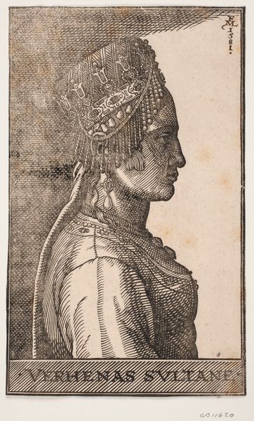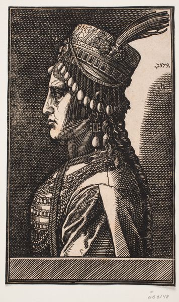 Editor: Here we have "Buste van vrouw met diadeem, naar rechts gewend," or "Bust of a Woman with Diadem, Facing Right," created in 1613 by Antonio Tempesta. It's a baroque engraving, quite small, housed at the Rijksmuseum. The detail is impressive; the shading gives her form real presence. What formal elements stand out to you? Curator: Consider first the starkness of line and the absence of color. This necessitates a keen understanding of form and shadow to convey depth. Note how the artist uses hatching and cross-hatching to model the contours of her face and neck, creating a palpable sense of volume. What of the lines create a dramatic silhouette against the blank space of the background? Editor: Well, the lines tracing the snake diadem, the braided hair, and ornamented dress seem quite distinct, giving this Baroque-style lady an air of power, perhaps a hint of mythology. Curator: Precisely. Observe the artist's calculated distribution of light and dark, establishing focal points, thereby guiding the viewer's eye throughout the composition. We might look, as well, at the balance achieved: the profile creates asymmetrical lines that create balance in what is not shown to the negative space, allowing an emphasis on her gaze. How does the overall structure relate to its meaning? Editor: That's something to think about, thanks. Seeing the attention to the technical elements enriches how I appreciate this artwork! Curator: Indeed, such attention will deepen anyone's regard for even what they do not know.