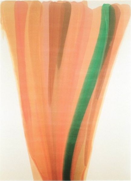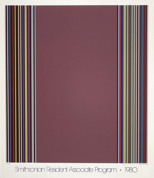 Curator: Gene Davis's poster celebrating the Smithsonian Resident Associate Program's tenth anniversary, created in 1975, immediately struck me with its vibrant, almost pulsating colors. Editor: I find that combination of earthy browns with vibrant orange, pink and purples rather cloying; I'd almost call it a study in mid-century color clashing, if I didn't know this poster represents such a powerful cultural institution. Curator: Consider how a poster such as this, using those strong colors and sharp geometric forms, acts almost as a kind of industrial messaging about cultural access. It reflects Davis's experimentation with seriality and repetitive form. He was fascinated by how the smallest shift in hue could affect perception. Editor: Fascinating. So, it's about making art more accessible, yet using methods of production – in this case, printmaking techniques that allow for multiple editions – to reach a wider public? Are the colors here less about individual expression and more about a democratization of the artistic experience? Curator: Precisely! This poster exemplifies how an artist engages with institutional frameworks to deliver aesthetics to the public. We could think about the distribution chains and economies created around an image like this. Where would someone have encountered it? What did it cost? It gives rise to questions about consumer culture and artistic value itself. Editor: That reframes everything I thought! This work isn't just about aesthetic taste, or an accessible print, but rather about what such broad institutional outreach signified. Did access become less hierarchical because of mass printing? Curator: In effect, the work encourages us to examine art within cultural conversations about societal norms and progress, highlighting its engagement within the power dynamics that shape artistic exposure and experience. Editor: That opens my eyes to new possibilities for appreciating Gene Davis's design! Thank you.