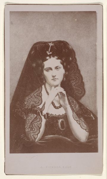 Curator: Looking at "La Dogaresse" here, a photograph created sometime between 1861 and 1867 by Pierre-Louis Pierson, what’s your immediate response to the image? Editor: There’s a haunting stillness, isn’t there? That intense, unwavering gaze paired with the almost theatrical costume… it's as if she’s daring you to judge her, or perhaps, more accurately, daring you to truly *see* her. The ornate lace detail, it's trying to hold me, but then she looks straight through me. Curator: Pierson's photographs, particularly of the Countess de Castiglione, of whom this is a portrait, offer an intriguing glimpse into the performative aspects of identity. She wasn't just photographed; she collaborated on staging these elaborate scenes. Here, she's enacting a historical role, specifically a Dogaresse of Venice, as the title suggests. Editor: I can see the staging, the theatricality that underscores my gut feeling. It's a portrait trying very hard to *be* something, yet at its heart it's still so still and vacant, even. Curator: Exactly. The Dogaresse were symbols of Venetian power and wealth, so by adopting that persona, the Countess, already a prominent figure, reinforced her own position and mystique. Photography allowed for the dissemination and control of her image, creating a carefully curated public persona. Editor: A public persona built on longing. The lace itself looks heavy, like it’s almost weighing her down, doesn’t it? Curator: Perhaps representing the burden of maintaining such an elaborate facade. Editor: Well, that makes sense. There’s such calculation on her face! Even the shadows seems strategically placed, enhancing that sense of drama. Curator: Consider the period too—the Second Empire in France was fascinated by historical grandeur and theatrical display. Photography was a relatively new medium, offering innovative ways to engage with both historical themes and the burgeoning cult of celebrity. It captured detail previously unachievable. The result becomes a portrait in dialogue with its own historical setting, using photographic processes, elaborate costuming and a willing participant to ask questions about the image of powerful women. Editor: Ultimately though, the lasting impression for me is the unsettling mixture of defiance and vulnerability in her gaze. And a hint of pity in response to her expression, too, perhaps. A lot is said in this image! Curator: A very evocative encounter, and thank you for sharing your observations, I do feel like you've added depth to the history with those intuitive thoughts. Editor: And thank you for always grounding my weird hunches.