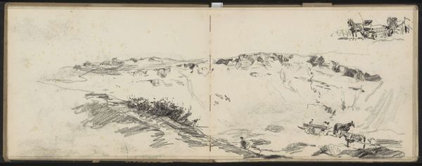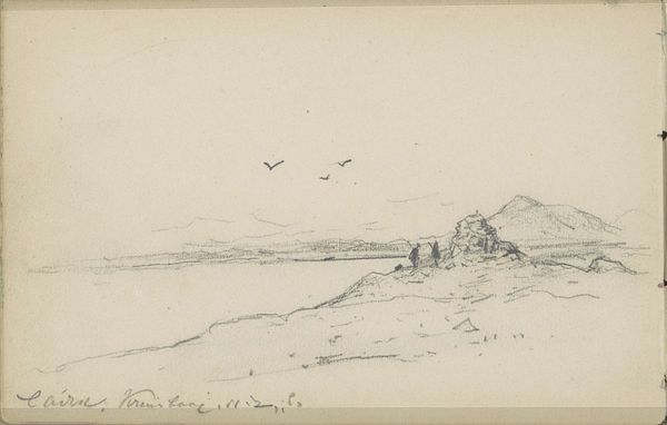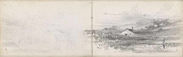 Curator: This quick sketch, “Landschap met huizen aan het water,” translating to “Landscape with houses by the water,” is attributed to Willem Cornelis Rip and likely dates from the late 19th or early 20th century. Editor: It evokes a certain somberness, doesn’t it? A very sparse and faded quality to it, especially in the foreground, makes me feel a sort of desolate calmness. Curator: Precisely. I see in this impressionistic rendering an attempt to capture the rapidly changing rural landscape. These quick studies would have been particularly resonant during that era, reflecting concerns around industrialisation. This idea of memory and the image carries heavy weight when viewed with an anthropological eye. Editor: It looks like a landscape trying to cling to its form. The faint outlines, like half-remembered details, seem to struggle to emerge from the page. The thin, almost vibrating strokes seem to emphasize the precariousness of this lifestyle that's about to vanish due to forces greater than it can understand. Curator: The landscape genre itself became a locus of identity formation, especially as traditional communities felt pressure. Who does this land belong to, who controls it? It makes me consider land rights in this moment, thinking about indigeneity and cultural erasure. Editor: And in this specific work, there are very minimal signs of human life. Just a couple structures dwarfed by the natural world, perhaps alluding to humanity's fleeting presence within the landscape. Trees are often the strongest images that resonate, giving a sense of protection but still standing tall within this sketch. Curator: And Rip employs a seemingly hurried technique, doesn’t he? It reflects the pace of social upheaval and rural restructuring, capturing fleeting moments as history rapidly unfolds, using just pencil and paper. The emptiness is very important. Editor: This also enhances the immediacy. It becomes about recording an ephemeral moment, about loss and remembering that space from a time that's now inaccessible, and gone. Curator: Right. It allows us to reflect on themes of power, resilience, and our collective narratives around land and belonging. Editor: Indeed. These understated sketches contain a complexity and depth of thought far exceeding their immediate impression.