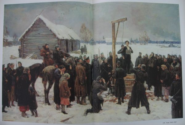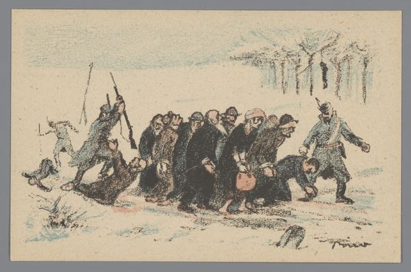 Curator: The first thing that strikes me is the winter scene, and these figures huddle together. You almost feel the cold seeping through the canvas. Editor: That’s right. What we’re looking at is Pyotr Konchalovsky’s 1942 oil painting, “Where to Give Blood Here?”—a poignant scene rendered in the depths of World War II. Curator: It feels incredibly human, doesn't it? The soft colors, the everyday setting—despite the lurking presence of war. What do you read into it? Editor: I see a moment thick with unease, perhaps even silent protest. Look at the power dynamics subtly at play—the armed men on horseback positioned at the periphery overseeing this group of women, and the focus on the instructions delivered on what they need to do for the war effort. Their expressions are unreadable, masking their emotions for protection, which speaks volumes to the pervasive environment of fear that shaped life at the time. Curator: The whole scene feels suspended, doesn't it? It's as if they are trying to navigate a surreal and disruptive situation, as if the social order is transforming before their very eyes and everything has become strange and dislocated. The horses certainly lend this feeling of another world invading everyday life. Editor: The war deeply changed Soviet society, transforming women’s roles, impacting everything. The war's impact also reminds us that social transformation comes at an immense cost, with ripple effects that touched individuals, families, and the national psyche for decades. This particular representation reflects the narrative the state would wish to project. Curator: I get that. Thinking of his other works, perhaps Konchalovsky found solace in portraying a scene where resilience and resistance intersect so naturally, a painting capturing that sliver of time so many lived through? Editor: Exactly. "Where to Give Blood Here?" remains a stark, beautiful reminder that even in moments of profound rupture and loss, humanity persists in its quiet struggles and silent defiance. Curator: What a privilege to be able to contemplate its meanings today.