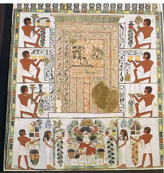 Curator: Looking at this composition, I see so much about daily life. Editor: It’s like stepping into a time capsule! My first impression is of a meticulously organized, yet surprisingly intimate scene. There’s a softness to the palette, a kind of sun-drenched feeling despite its formality. Curator: Absolutely. What you are responding to, perhaps, is how art and ritual intersect. This mural fragment, titled "Opferszene, Sitzend Zweimal Nacht Und Taui," created around 1390 BC, illustrates a sacrificial scene, and its construction with fresco and mixed media carries its own weight of history. The setting comes alive through gesture, color and symbol. Editor: I’m immediately drawn to the figures in the upper register, especially those repetitive, almost rhythmic rows of offering-bearers. It feels almost…mechanical. Curator: They serve a cultural and ceremonial role in ancient Egypt; their posture represents deference and commitment. Those repeating gestures speak to a rigid social hierarchy but also of communal intention, of people coming together to support each other through the life cycle. You know, the seated couple and their offerings and then lower down another group of attendants. Editor: So, the lower scene mirrors and answers to the upper scene? Do you think there's a conscious echo there, linking earthly sustenance with the divine order? It also makes me ponder the lives of these people captured. Their clothing, what appears to be food laid out—what did it all mean to them, beyond just representation? Curator: Food held symbolic value, connected to provision, sustenance, and spiritual nourishment in the afterlife. What about the couple? Note their placement in this mural. Consider the gestures: Their pose speaks to shared reverence but also points to specific rituals for commemoration and honoring life’s passage. Editor: I’m also caught by the lack of perspective, a kind of flattened dimensionality that's both charming and strange to our modern eyes. Curator: That's true of Egyptian art. Think of their stylistic rendering of time and the afterlife! What appears 'flat' conveys an entire belief system that values representation beyond mere duplication. Editor: It all weaves together such a vivid narrative—rituals, beliefs, and snapshots of lives lived thousands of years ago. A real feast for the eyes and the imagination, it gives you so much to consider. Curator: Indeed, offering insight into a rich tapestry of existence—history etched into color and form.