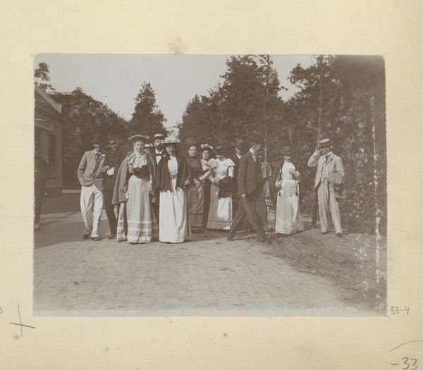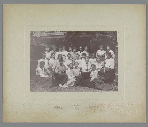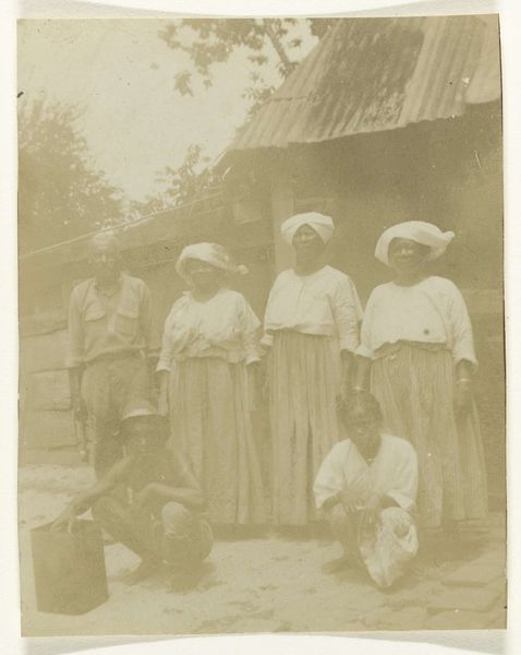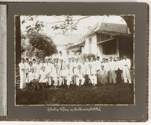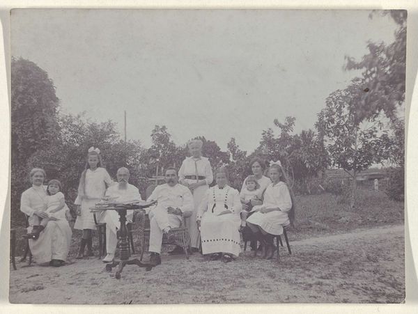 Editor: This is a photograph titled "Portret van familie Boers met personeel," created in 1919. It's a gelatin silver print. It's a rather formal group portrait, but the stark contrast between the family and their staff is quite striking. How do you interpret this work, considering its historical context? Curator: This photograph provides a window into the power dynamics inherent in colonial societies. The family, likely of Dutch descent, is posed prominently, while the “personeel,” the staff, are arranged in a way that subtly emphasizes their subordinate position. Consider the historical moment—1919. What societal structures were in place that normalized such visual representation? Editor: It's interesting that you mention power dynamics. The all-white clothing seems to reinforce that, especially considering that it probably wasn’t easy to keep such garments clean. Is there a deliberate statement about privilege being made here? Curator: Precisely. The choice of clothing, the setting, the very act of commissioning a photograph—all speak to a specific class and racial hierarchy. It’s vital to dissect the photographic representation and what is not being represented. Think about what voices are absent from this picture and why. Whose narrative is being prioritized, and at whose expense? Editor: That’s a perspective I hadn't fully considered. So, seeing this portrait not just as a family photo but as a statement on colonial power structures? Curator: Exactly. And it encourages us to critically examine the visual rhetoric employed to legitimize such structures. What responsibility do we, as viewers, have when engaging with images like these? How can we use them to challenge the legacies of colonialism rather than perpetuate them? Editor: I learned to read beyond the surface, seeing how an image, seemingly straightforward, can be loaded with social and historical meaning. Curator: Yes, and remember, our interpretations are never neutral. By asking difficult questions about identity, representation, and power, we can strive to create a more just and equitable understanding of our past and present.