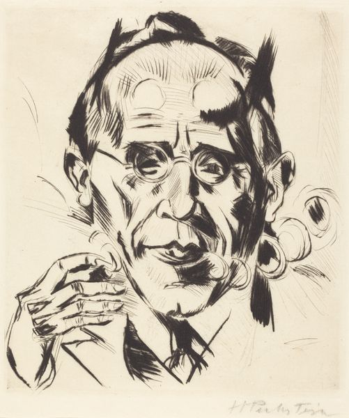 Curator: Here we have Max Pechstein's etching, "Dr. Paul Fechter," created in 1921. It's a compelling portrait, executed in the German Expressionist style. Editor: My first thought? He looks intensely focused. Like he’s peering into your very soul, or maybe just judging your art choices, haha. I find the textures almost a little abrasive, adding to the severity. Curator: Yes, the sharp lines and tonal contrasts are quite striking. Considering its place within German Expressionism, we can see it as a reflection of the anxieties of the time. Post-World War I Germany was dealing with significant social and economic upheaval. This portrayal, with its starkness, aligns with the broader movement questioning established norms and exploring raw emotional states. Editor: Definitely a turbulent era bleeding through the lines. I almost feel a kinship with this guy though, staring into the abyss of the art world and just… trying to make sense of it all. The nervous energy is palpable. And he definitely looks like the kind of dude who'd know all about art theory. Or politics, or philosophy… Curator: Given that Dr. Paul Fechter was an influential art critic and writer at the time, your observation hits the mark! Pechstein's choice to render him this way—using etching to create such jagged lines and stark contrasts—arguably conveys Fechter's critical perspective, his analytical mind. Perhaps Pechstein admired, or even feared, Fechter's gaze? Editor: Maybe a bit of both? Like a healthy dose of respect mixed with "please don't tear my work apart". And there's a bit of an unsettling gaze there! Curator: We might consider also the role of intellectuals in shaping public discourse during this era, a crucial subject, as art became increasingly politicized. This portrait then is not merely a likeness but a statement about the power of the critic, the artist, and their interconnected struggle to define cultural value. Editor: I can almost hear their lively discussions in some smoky Berlin café now! It’s like this image captures a moment, a tense debate distilled into lines and shading. I kinda wanna jump into this etching. Curator: A journey back to the Weimar Republic through art! Food for thought. Editor: Absolutely! It's a lot to take in. I think I like Dr. Fechter now; I get him. Thanks for untangling that with me!