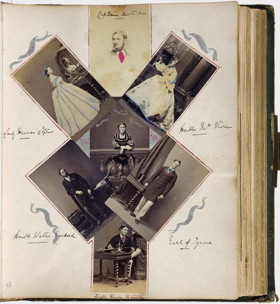 Curator: This captivating page, found in the Harvard Art Museums, features albumen silver prints by Mary Georgiana Caroline Cecil Filmer. The photos, arranged around a central portrait, present various members of the British elite, dating back to 1868. Editor: It has a very formal air, doesn't it? Yet, something about the tilted portraits and handwritten captions gives it an intimate, almost scrapbook-like feel. Curator: Indeed. The sepia tones evoke a sense of nostalgia, of looking back at a specific moment in British social history. The choice of placing Mrs. Marshall at the center could suggest her significance within the group. Editor: Or perhaps it highlights the restrictive roles of women during that era. Placed at the very centre, and yet very bounded by her role as wife or mother. Note how the portraits emphasize status and lineage through dress and pose. Curator: I see your point. The image becomes a record of power and privilege, but also of the constraints imposed by societal expectations. Editor: Exactly. It's a fascinating look at the visual language of class and identity in Victorian England, isn't it? Curator: Absolutely. A poignant reminder of how photographs can function as both personal mementos and historical documents. Editor: A rich tableau, to be sure. One that speaks volumes about the complexities of self-representation and social hierarchy.