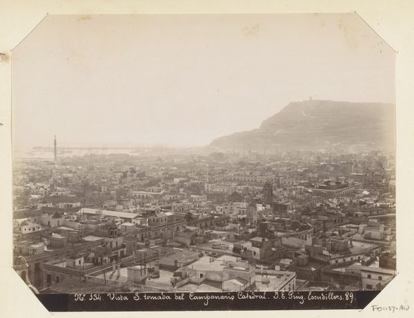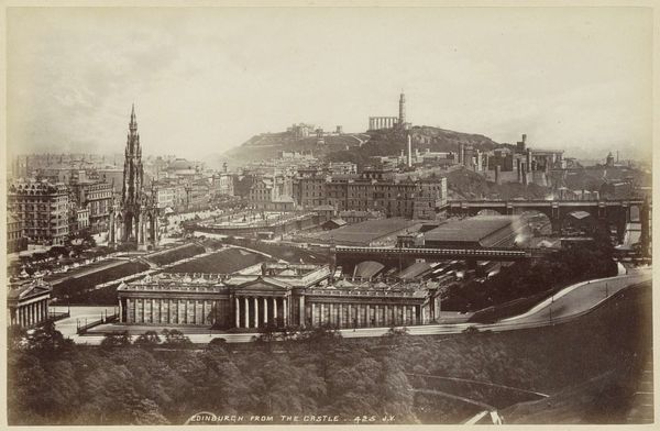 Curator: Looking at this image, the whole scene is washed with this wistful melancholy. It is quite atmospheric. Editor: That's a beautiful observation. We're looking at Edmond Bacot’s “Vue générale de Rouen,” a gelatin-silver print created between 1852 and 1854. It's currently held at the Metropolitan Museum of Art. I think what grabs me most is the city sprawling towards the horizon under such a weighty sky. Curator: Weighty is right! It feels like a forgotten memory, all soft focus and diffused light. There's a loneliness there, despite the busy cityscape. Does that make sense? It reminds me a bit of the feeling you get from daguerreotypes, those early photographs. Editor: Absolutely. The photograph, while offering this ostensibly objective representation of the city, can never escape the human element embedded in both its production and its consumption. The selection of the vantage point, and indeed, the technological limitations, subtly impact meaning. What do you think about this idea in light of photographic realism? Curator: I agree. The imperfections, that soft focus, even what appear to be some chemical anomalies, add texture—making it, dare I say, even more "real" than a clinical depiction would be. Because, let's be honest, how often do we perceive anything without some degree of subjective filtering? It is never just data. Editor: Yes! That tension is palpable. This work occupies an important historical moment—Rouen experienced significant industrialization around this period, led primarily by textile production. This photograph is not just documenting architecture; it’s indirectly gesturing towards social and economic shifts within a complex historical context. Do you perceive that industrial activity? Curator: It’s subtly there, like a breath held in, a pressure just beneath the surface of what looks like calm. There are little signs that something is rumbling on and you see traces in the air near the industrial areas, which add to the slightly haunting feeling. It invites us to ponder change and its impact. Editor: Ultimately, I believe "Vue générale de Rouen" stands as a compelling reminder of how seemingly objective mediums like photography are laden with intentionality, offering multifaceted interpretations of our ever-evolving human experience. Curator: It certainly leaves me thinking about how the past speaks to us—a hushed but insistent voice. Almost like an echo of memory, just at the very edge.