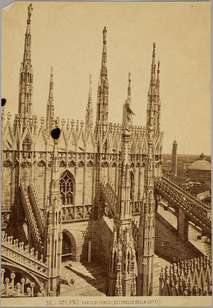 Curator: This albumen print presents Giacomo Brogi’s “Milan, The Cathedral of the Royal Palace.” It’s a stunning view of the Duomo. Editor: It's overwhelmingly ornate; the labor involved in its construction must have been immense. One wonders about the social conditions of the workers. Curator: Indeed. Photography like this played a crucial role in shaping perceptions of Italian national identity and architectural prowess. Brogi was deeply enmeshed in that project. Editor: The density of detail, captured through the photographic process itself, speaks to the city's ambitions and the exploitation of resources. Curator: And its accessibility – making such grandeur available to the masses. Editor: Ultimately, it prompts reflection on the human cost embedded within such displays of power. Curator: A striking image, regardless of the observer’s viewpoint.