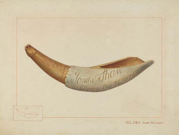 Curator: This is "Powder Horn," a drawing by Howell Rosenbaum, around 1938. What are your first thoughts? Editor: Well, it’s a very simple drawing. The horn has an inscription about Cabell County, Virginia, from 1814. It feels like an attempt to capture a historical artifact. How do you interpret this work? Curator: I think we need to unpack that idea of "capturing." Rosenbaum made this drawing during the New Deal era. Consider that context: The Federal Art Project employed artists to document American material culture. This wasn't just about preservation, but about constructing a national identity, right? What does choosing to represent this object say? Editor: So it's not *just* a powder horn. It's tied to ideas of Americana? Curator: Exactly. The powder horn itself symbolizes frontier life, hunting, self-sufficiency, perhaps even a romanticized vision of early American individualism. The inscription grounds it in a specific place and time, but also raises questions. Who was "J.A. Dial?" Why document *this* horn from Cabell County? This links to ideas about regionalism, local histories being woven into the national narrative. Editor: So, it's like the artwork uses a single object to represent the historical period of 1814 and frontier values within that region of Virginia, but through the added lens of Rosenbaum in 1938. Curator: Precisely. It's not just about documenting history, but also about who gets to write that history, and what aspects of it get amplified during times of economic and political stress, right? Whose narratives are included and whose are erased? Editor: That’s fascinating! I hadn’t considered all those layers. Thanks for pointing that out! Curator: My pleasure. It's a good reminder that even the simplest image can carry a heavy load of historical meaning.