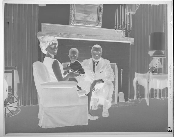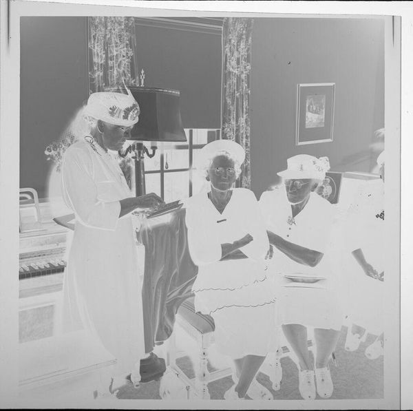 Curator: This is an untitled work by Peter James Studio, housed here at the Harvard Art Museums. It captures a group of people standing at a party. Editor: It strikes me immediately how the inverted tones create a dreamlike, almost ghostly atmosphere. The figures seem caught in a moment of frozen animation. Curator: Absolutely. The image invites questions about social gatherings. Who are these people, and what relationships bind them? Considering it's a party, what socio-political dynamics might be in play? Editor: I'm drawn to the composition itself. The arrangement of figures creates a series of intersecting lines and shapes that guide the eye. The flag situates the image within a specific time or place. Curator: The presence of a flag does offer a potential clue, doesn't it? It subtly hints at themes of national identity and perhaps even exclusion. Editor: I find it interesting how the figures seem to interact without truly connecting. Each is isolated within their own space, defined by the formal constraints of the photograph. Curator: Seeing this image reminds me of the artist’s unique point of view, a silent observer documenting a specific segment of society. Editor: Ultimately, the photograph’s strength lies in its ability to prompt us to question the nature of representation and perception.