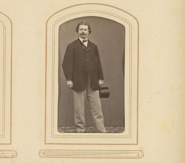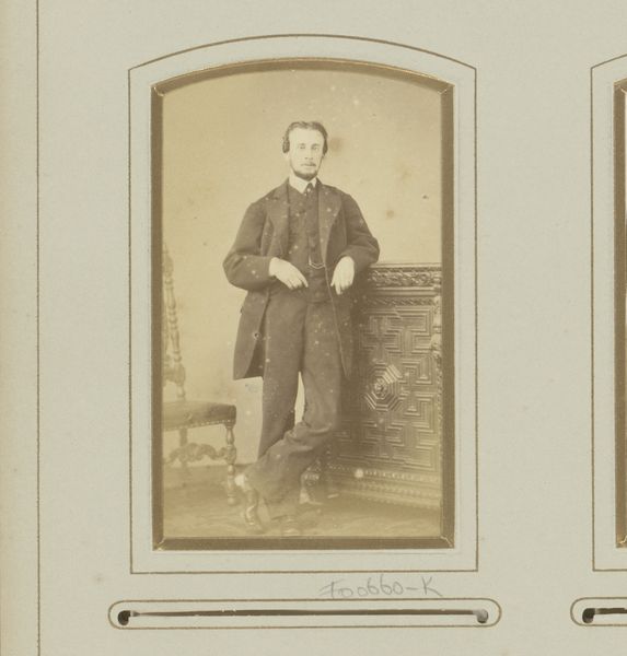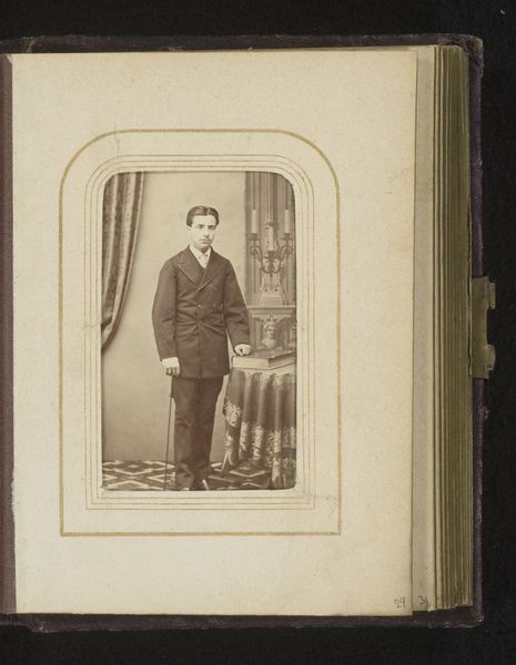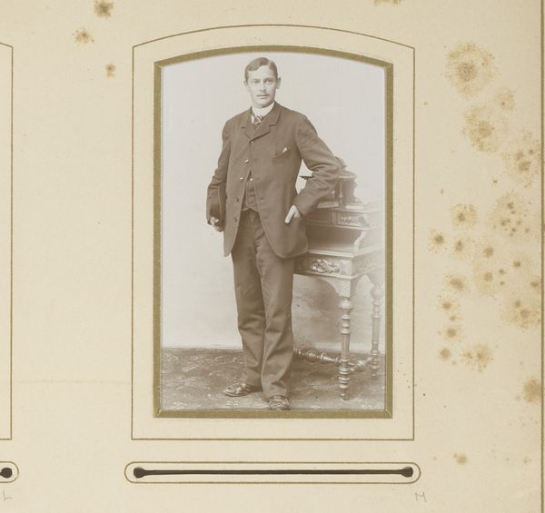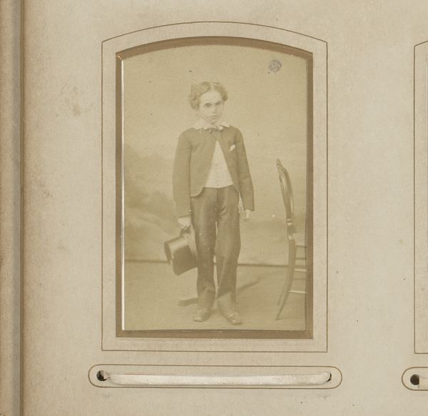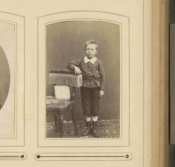 Curator: This photograph, entitled "Portret van een jongen, staand bij een tafel," roughly translated to "Portrait of a boy standing by a table," was created by Photographie Française of Amsterdam, sometime between 1875 and 1899. It's a fantastic example of late 19th-century portraiture. Editor: My first impression is one of contained formality, a stillness and quiet dignity about the young boy. The muted tones enhance that somber atmosphere. He seems aware of the camera, aware of being documented for posterity. Curator: The studio portrait was indeed about projecting an image of respectability, especially for the emerging middle class. Examining photographic portraits from this era, we can see how new social identities were being constructed and affirmed through visual representation. Editor: And note his clothing – almost a uniform. The severe cut and dark color. We need to read that as part of the power dynamic being represented, perhaps mirroring constraints placed upon youths of the era. This also reflects on social class as it denotes the rise of department stores in providing affordable yet 'class-accurate' styles. Curator: Precisely. The clothing signifies status, the carefully arranged tableau speaks to aspiration. Also consider the floral arrangement on the table – nature carefully curated and controlled, mirroring, perhaps, expectations placed on the child himself. The politics of portraiture really do reveal a societal landscape. Editor: But there's something vulnerable in his gaze as well. Despite the formality, there’s a raw, almost questioning element that seems at odds with the rest. We must ask if it serves as a subversive push back or even highlights a common human experience as many other artists have showcased over the years. Curator: I think it reflects an inherent tension within the portrait genre itself: the struggle between self-presentation and a desire for authenticity. The photo exists as evidence and, ultimately, speaks volumes about representation, performance, and the historical construction of identity. It opens the way to discussions of modern theory and identity. Editor: Absolutely, looking through an intersectional lens truly brings so many ideas to light regarding social construct and class relations during that era. It's such an illuminating glimpse into a specific historical moment. Curator: Indeed, its historic depiction, coupled with contemporary theory and discussions regarding the modern human condition, continues to bring about vital cultural discussions.