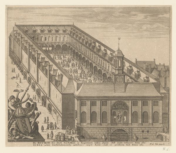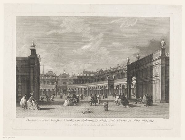 Editor: This stately engraving before us, crafted between 1684 and 1691, captures "Gezicht op het Capitool te Rome," or "View of the Capitoline Hill in Rome" by Jan Lamsvelt. What strikes you about this cityscape? Curator: The density, the intricacy—the linear elements dominate, directing the eye in very specific pathways through the composition. Notice the emphasis on perspective and the controlled application of light and shadow created with close engraving lines. It’s almost claustrophobic despite the openness of the scene. Editor: Yes, I sense that feeling too. The Capitoline Hill has always represented power and authority—from ancient Roman temples to its Renaissance redesign by Michelangelo. Consider how Lamsvelt presents the ascent. The converging lines of the ramp, populated with figures, lead us towards the piazza at the summit where you will find those statues mounted. Curator: Absolutely. And observe how the artist uses the architecture—the buildings acting as framing devices. See how Lamsvelt carefully rendered the depth and structure, utilizing rigorous linear precision, which is particularly pronounced with his medium of print. The very act of capturing this iconic vista via engraving bestows a kind of permanence, don’t you think? Editor: Undoubtedly. Engravings, like this, allowed for widespread dissemination of cultural symbols. Here, the horse-drawn carriages are interesting juxtaposed next to those pedestrians climbing the hill, perhaps a nod to Rome's blending of power with more grounded human experience. Consider also how, by meticulously documenting it, he allows people who might never see Rome a way of visiting it vicariously, strengthening the mythology around its imperial grandeur. Curator: I concur—it transforms a three-dimensional space into a controlled, two-dimensional construction. A demonstration of technical skill as a way of conveying not just appearance, but the underlying structure. Editor: For me, understanding that intersection of cultural might with the artistic strategies makes Rome all the more fascinating and resonant, even now, centuries after Jan Lamsvelt first committed it to paper. Curator: Indeed, the strict control over medium mirroring the sense of Roman authority so well portrayed in the lines and spaces Lamsvelt creates.